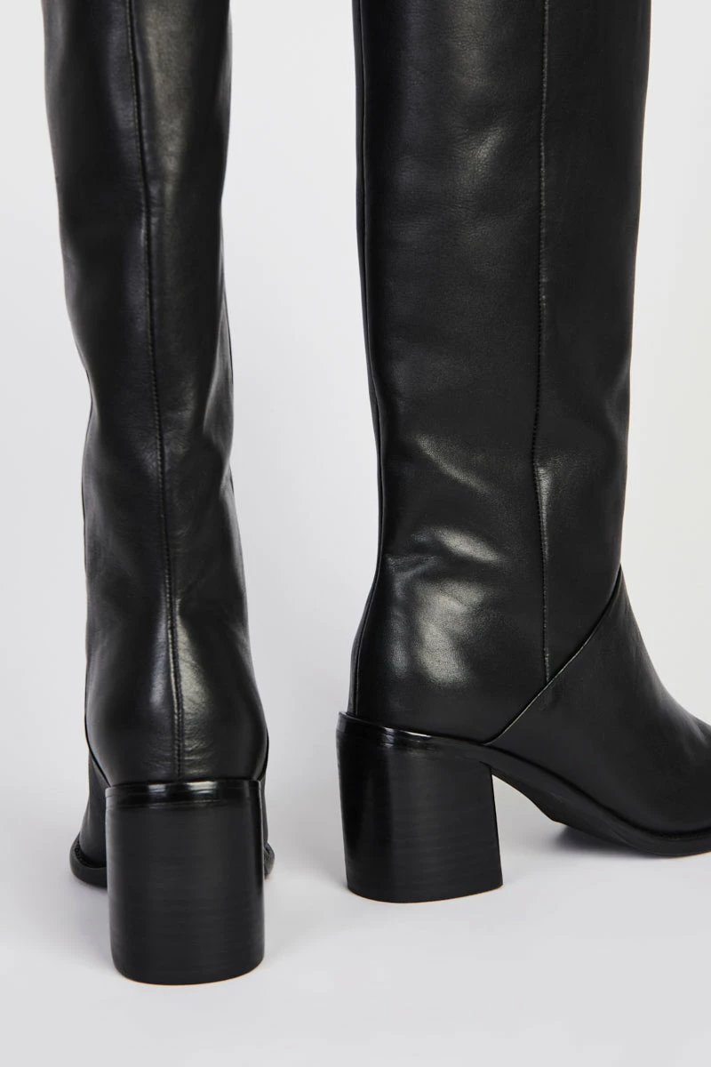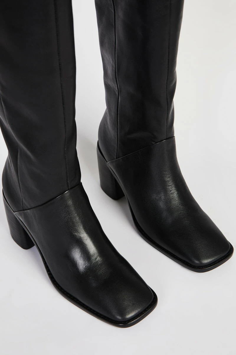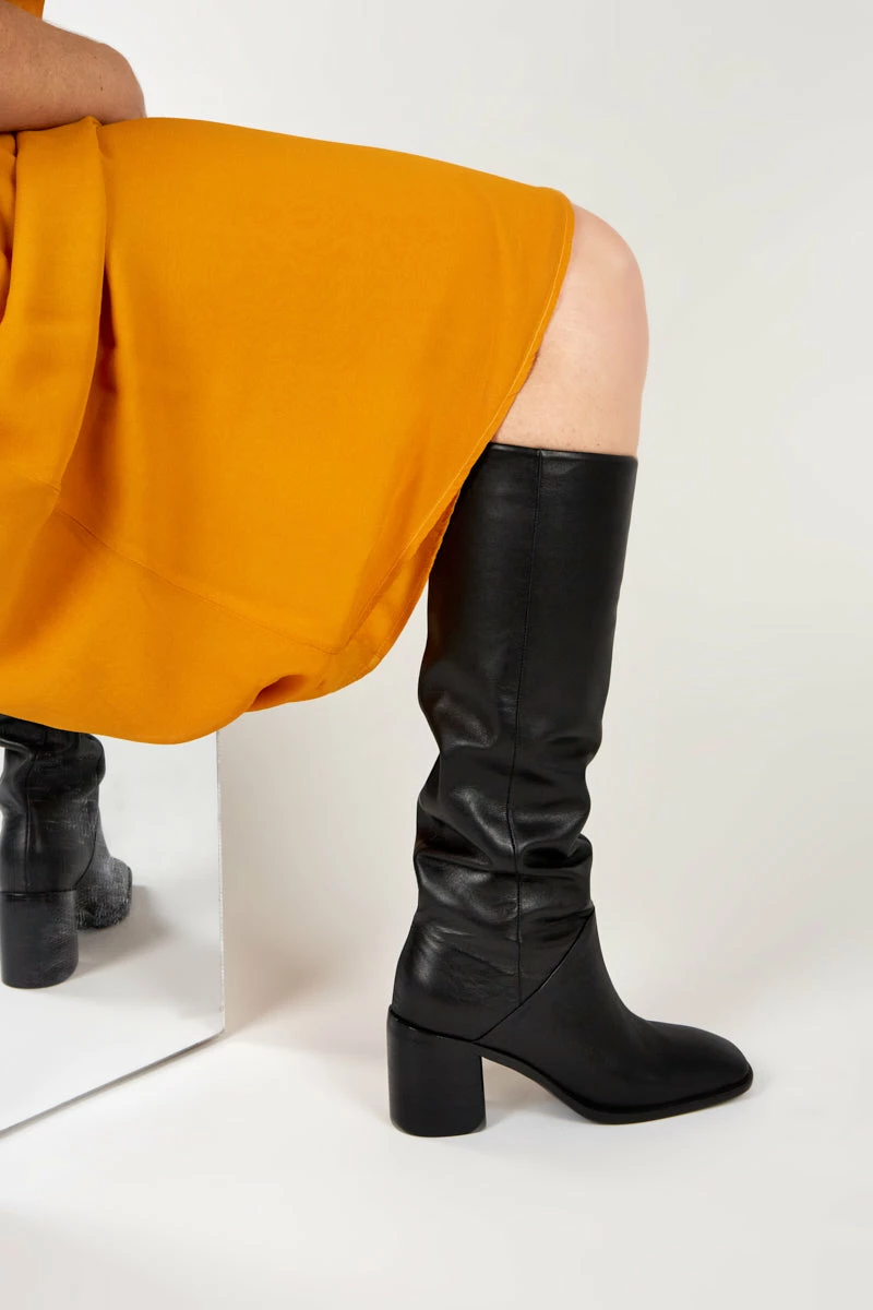 A tall boot that is different. We love the combination of the square two with the straight shaft, wear it bunched down, or tall and straight.
