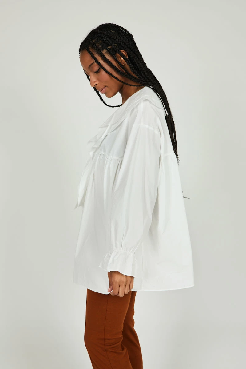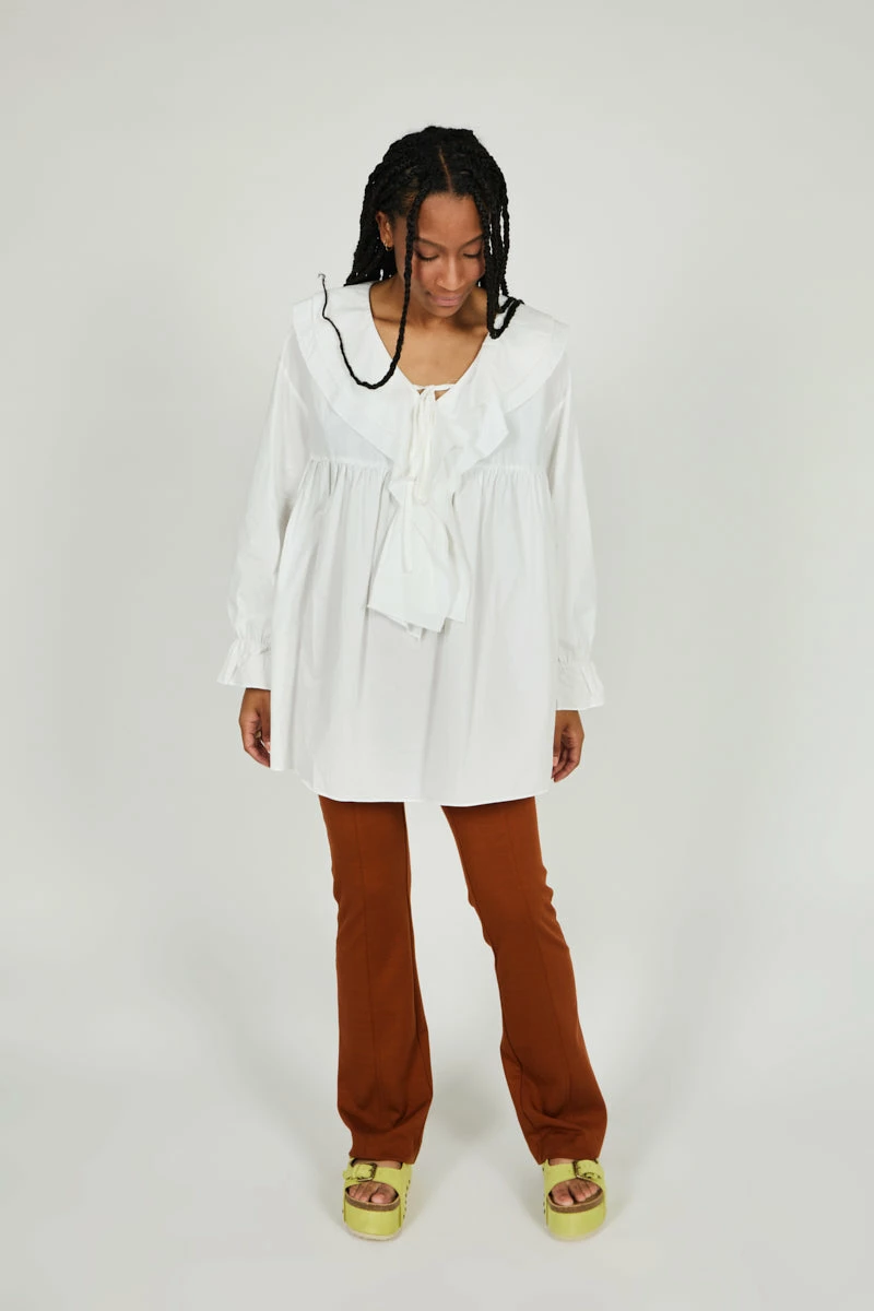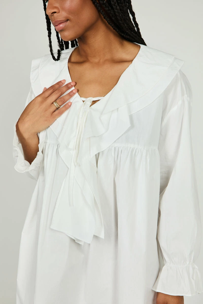 - Full Aline Shape, Empire Waist, Ruffle Detail and Tie at Neckline, Elastic at Wrist with Ruffle