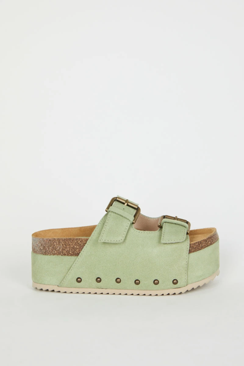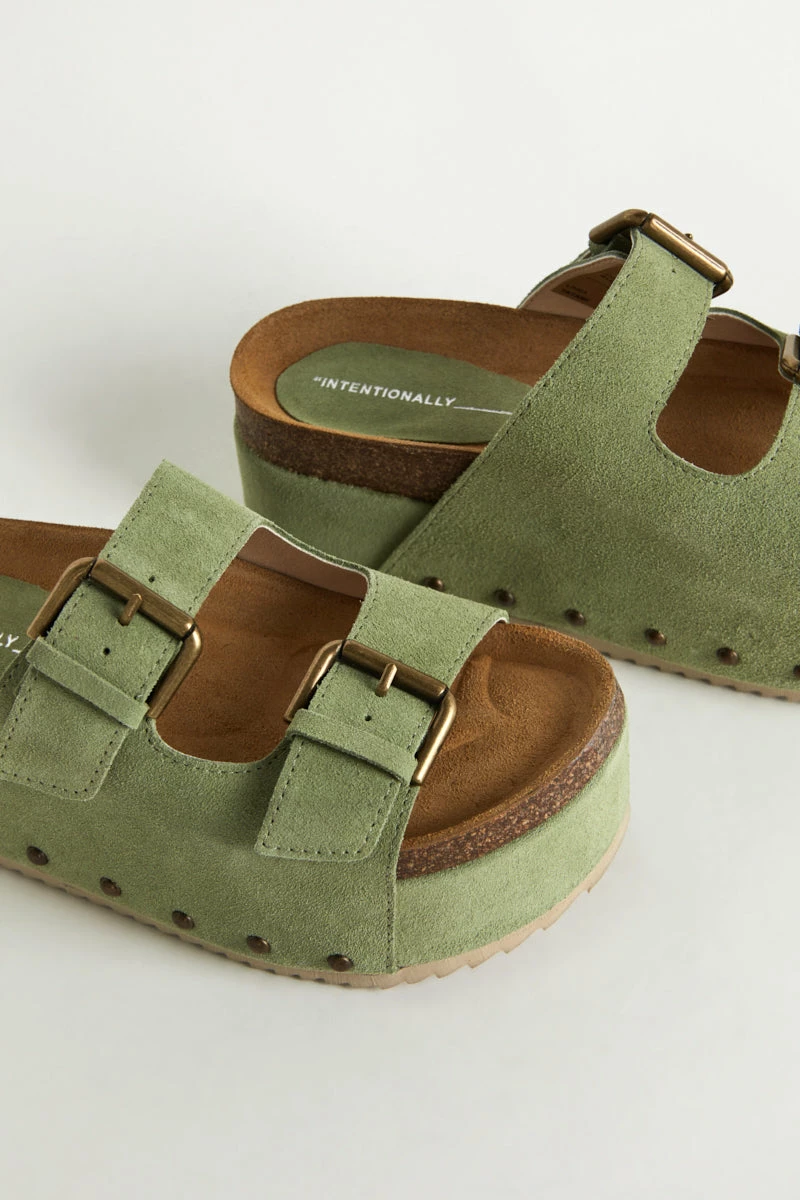 Solid platform sandals with a sleek look. The sage color adds a modern touch. Great for both casual and semi-formal occasions.