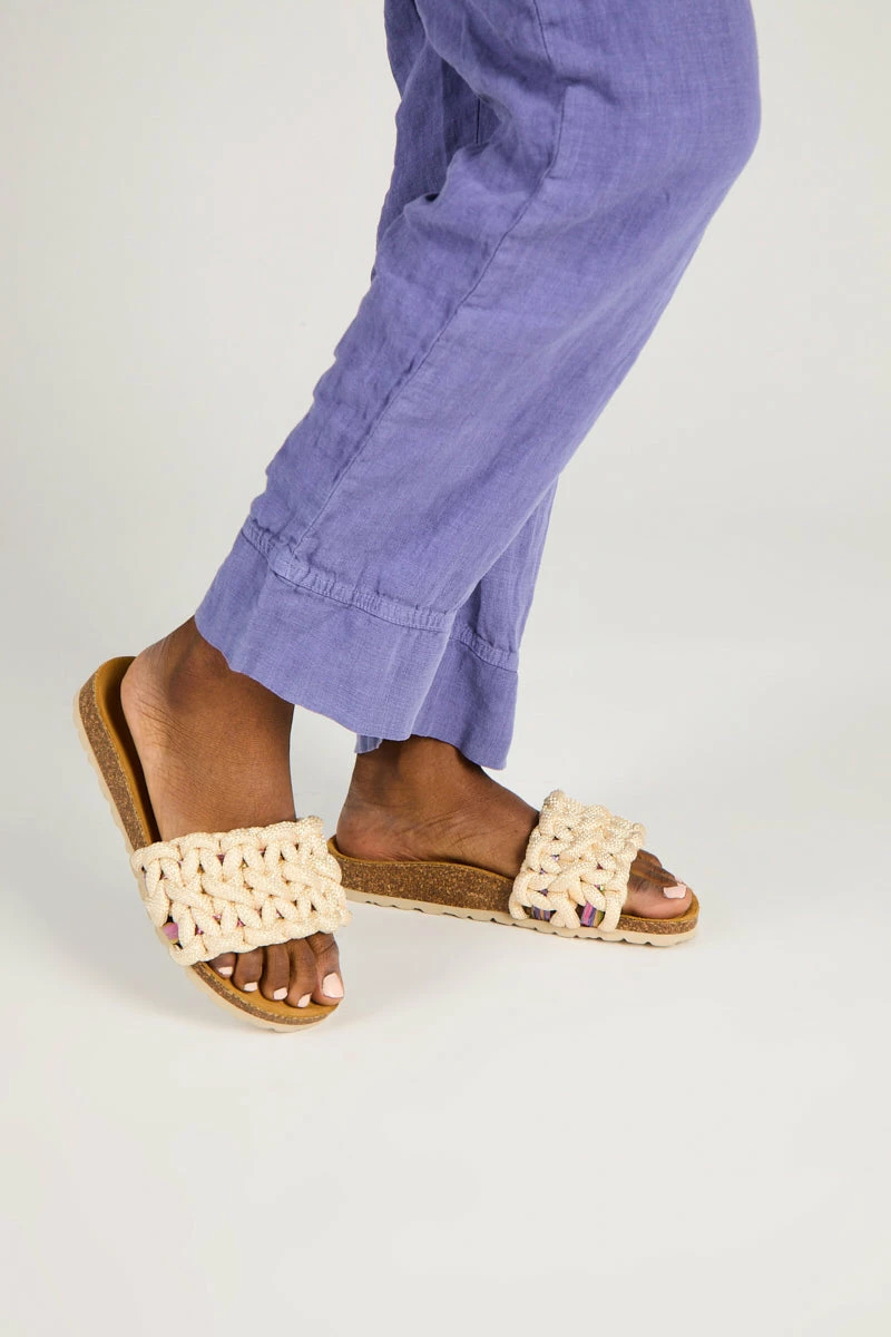 Our version of macrame, this woven cord sandal has colored raffia strips under