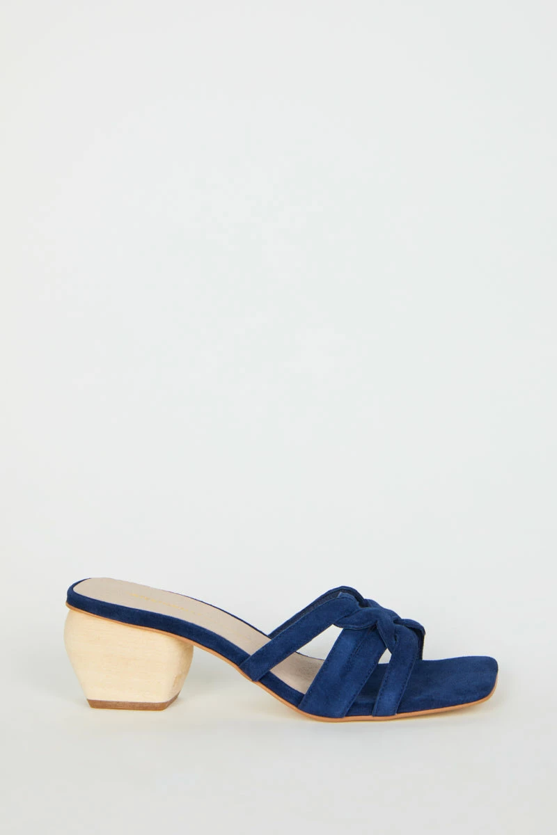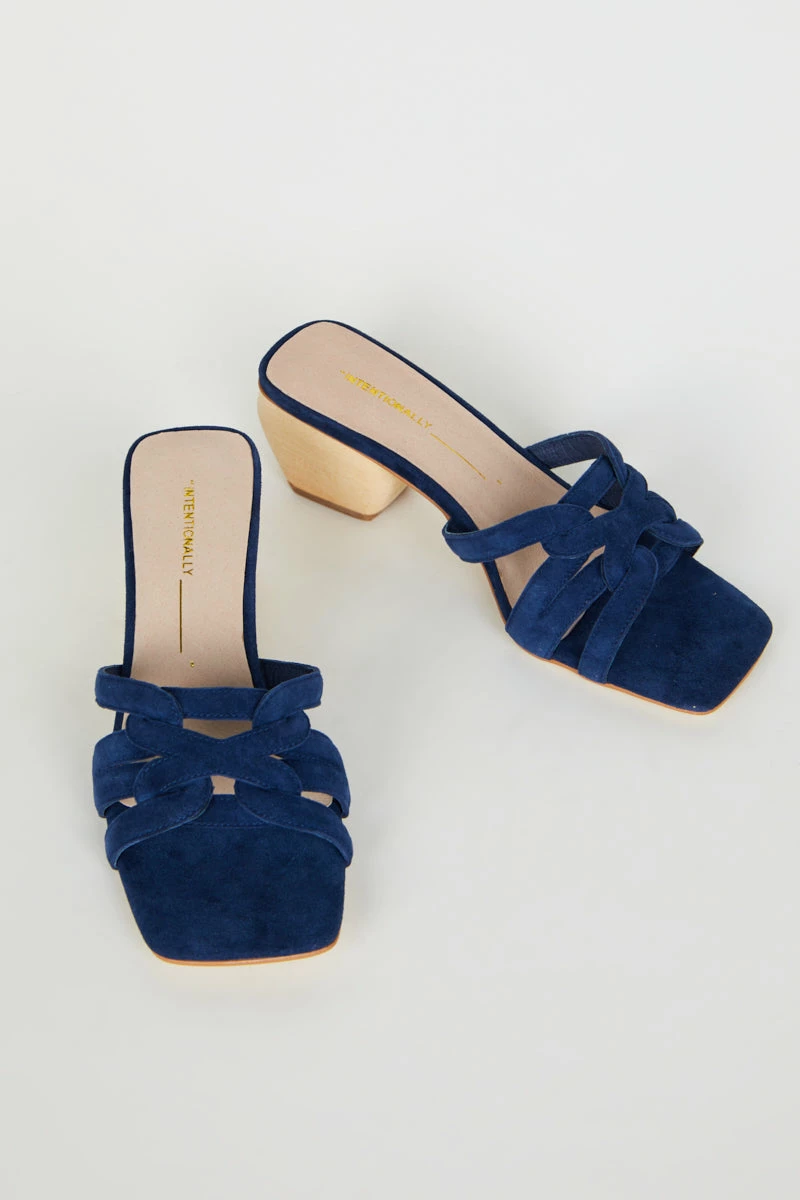 Soft suede interlocked straps on the perfect natural wood heel create the most chic vintage inspired slip on heeled sandal.