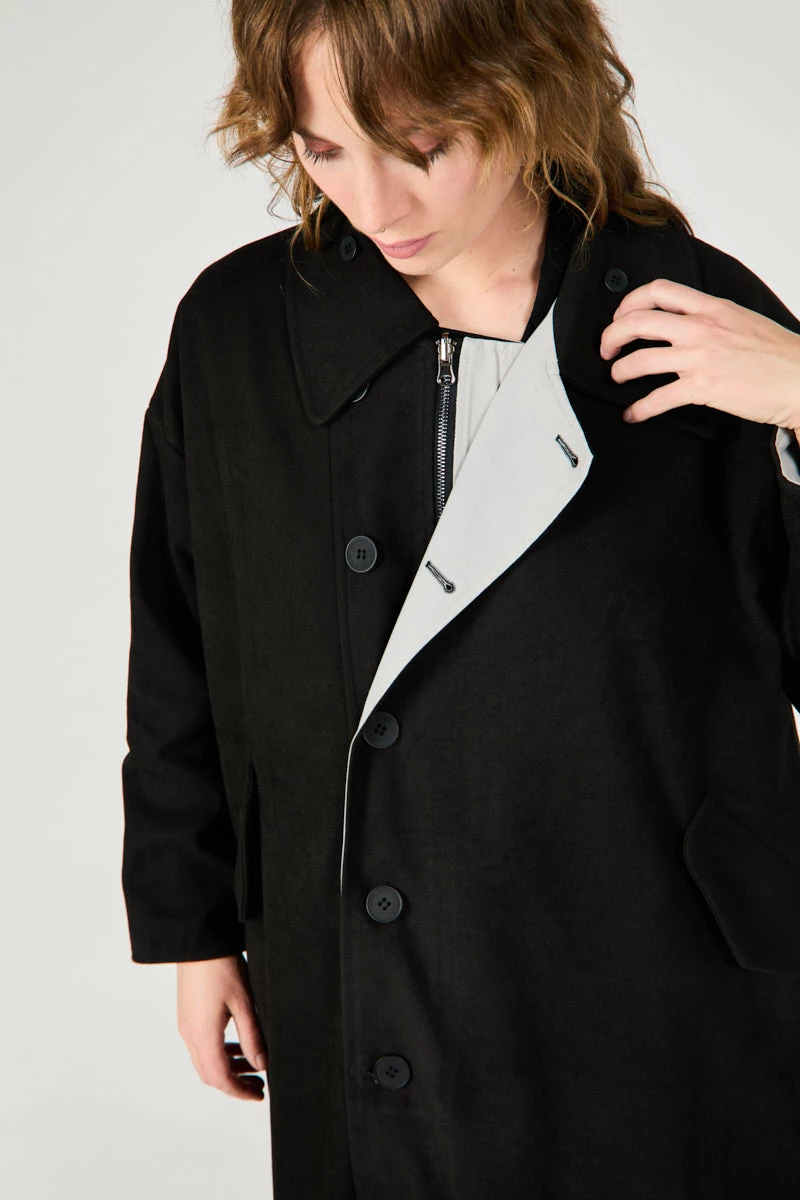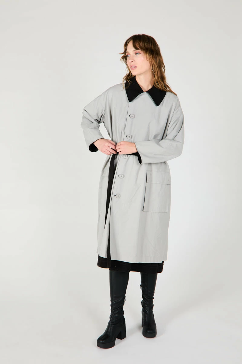 Heavy weight belted trench, the PETERS combines a relaxed fit and tie belt detail to create the ulitmate fall staple. Asymetrical button detail, fully lined and belted, outter material is fleted cotton for added cozy vibes.