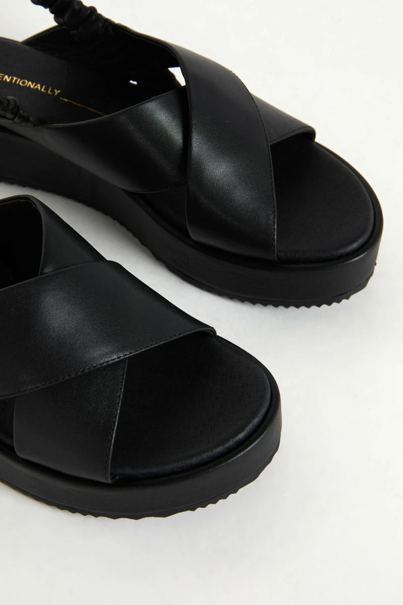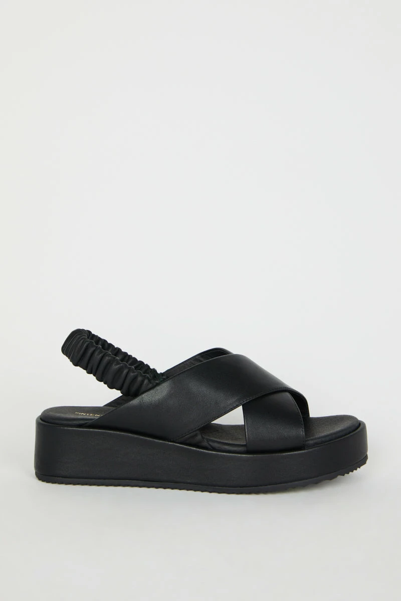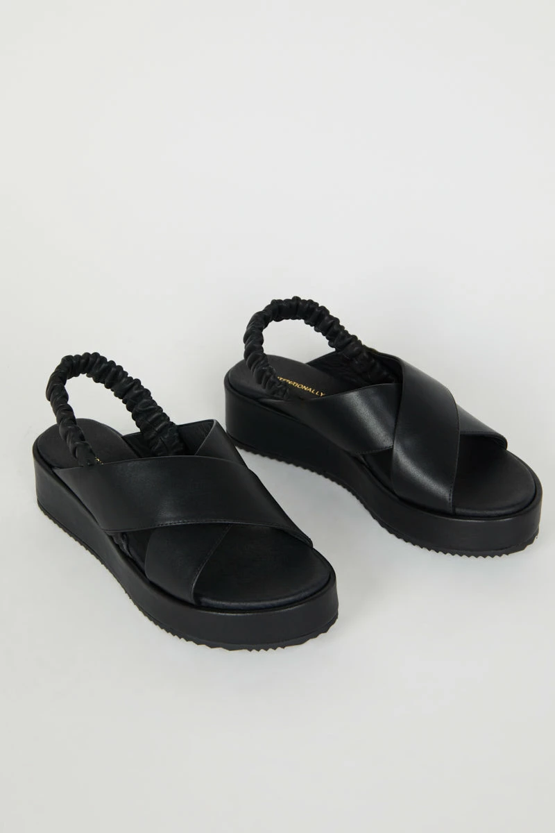 Our updated X-band mini-flatform sandal is back this seaon with a rouched elastic back strap. Casual and elevated all at once, thanks STARRY.