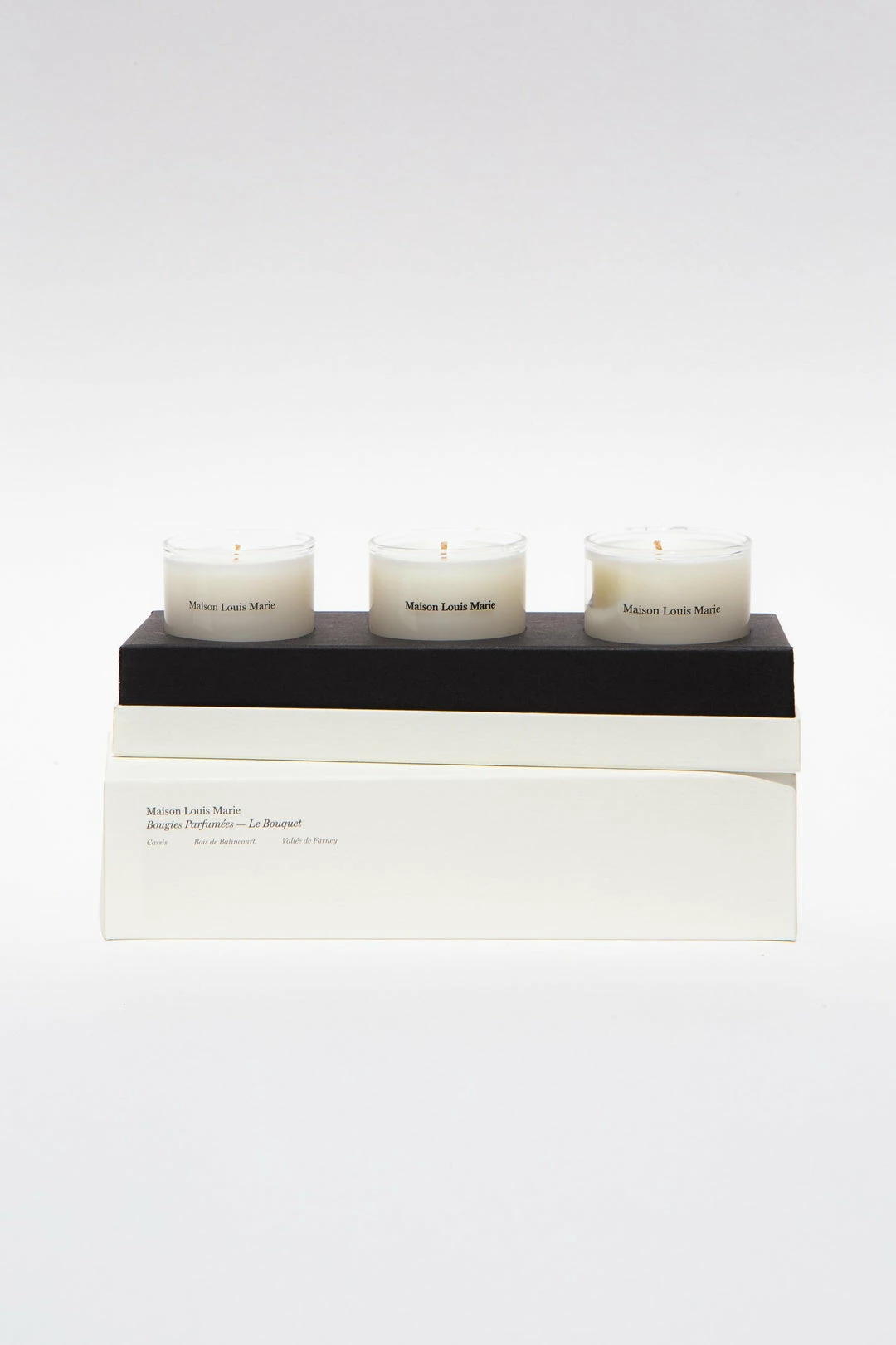 Maison Louis Marie candle Gift Set “Le Bouquet” includes an Antidris Cassis, N0.04 Bois de Balincourt & N0.09 Vallée de Farney votive candles. This set is comprised of 3 scented candles with Cassis & Rose, Sandalwood  & Grapefruit notes.