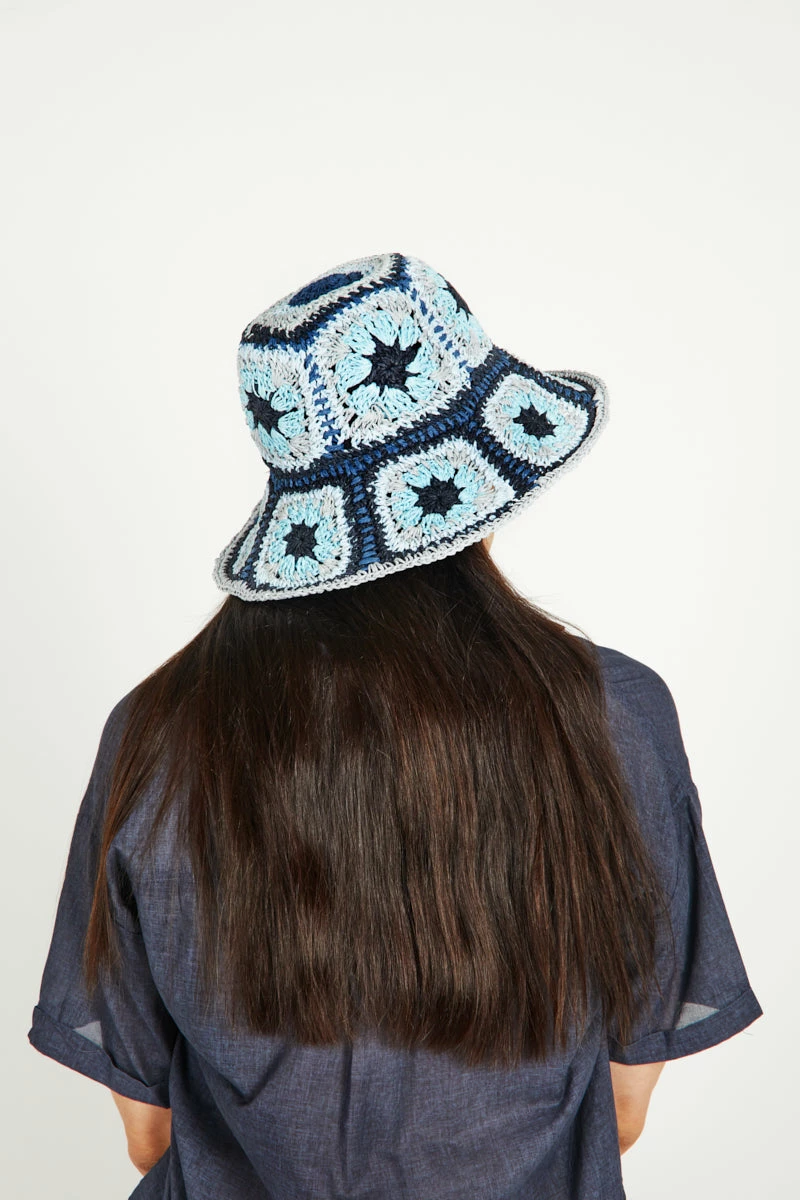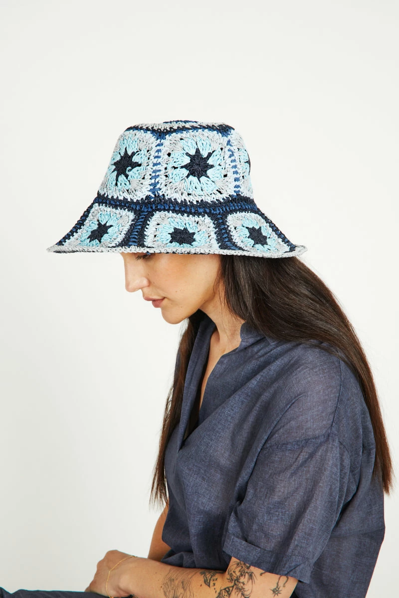 Full vintage hat fantasy in this raffia woven patchwork deep bucket.